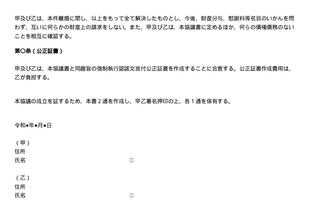 甲及び乙は、本協議書と同趣旨の強制執行認諾文言付公正証書を作成することに合意する。公正証書作成費用は、乙が負担する。